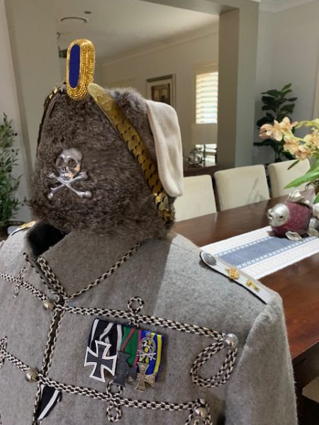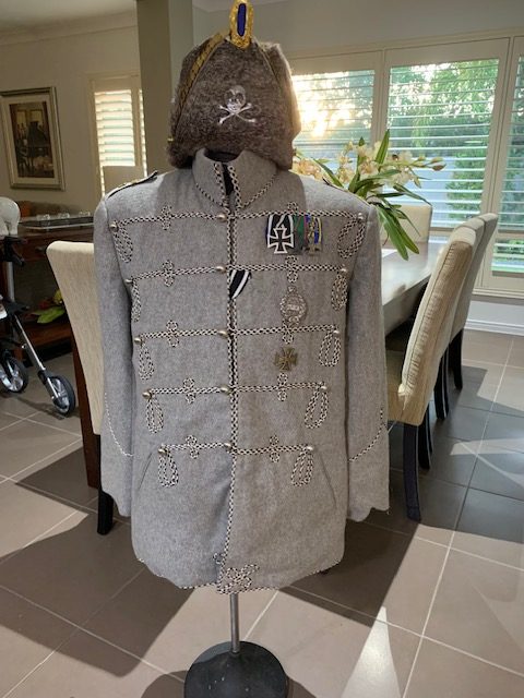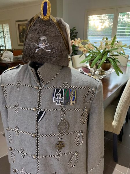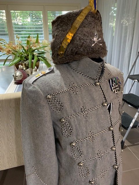 REPLICA WW1 PRUSSIAN HUSSARS TUNIC SIZE 42, HAT SIZE 58, WITH ALL MEDALS AND BADGES, ONE ONLY