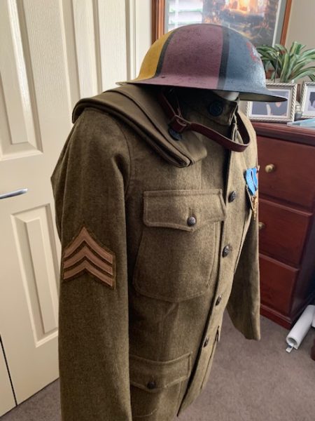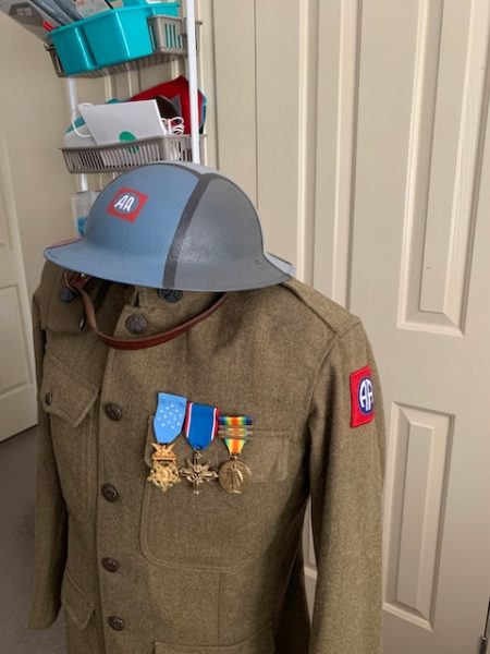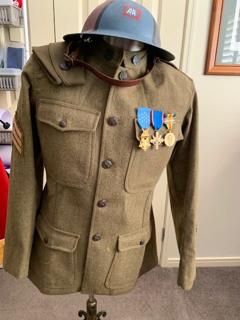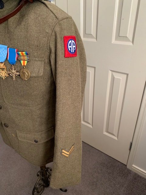 REPLICA US ARMY 82nd DIVISION SERGEANTS TUNIC, SIDE CAP, HELMET. MEDALS AND ALL INSIGNIA, TUNIC SIZE 40, CAP AND HELMET SIZE 58, ONLY ONE AVAILABLE